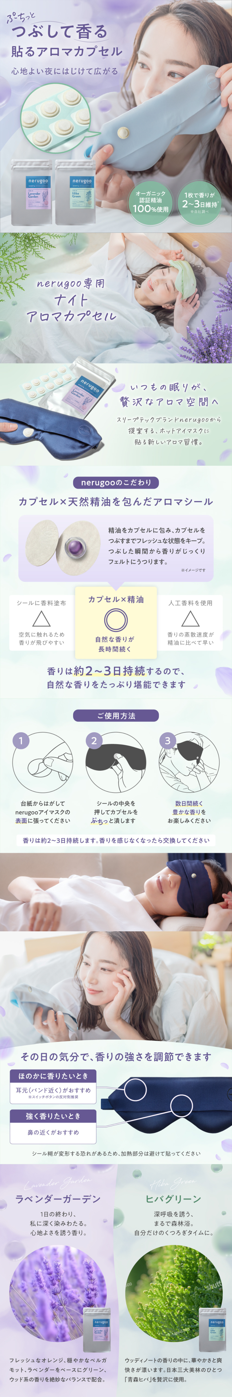 アイマスクに貼って潰すだけ。天然精油を閉じ込めたカプセルが弾け、新鮮な香りが一瞬で広がります。使うその瞬間まで香りを封じ込める独自処方で、いつでもフレッシュリラックスタイムを楽しめます。